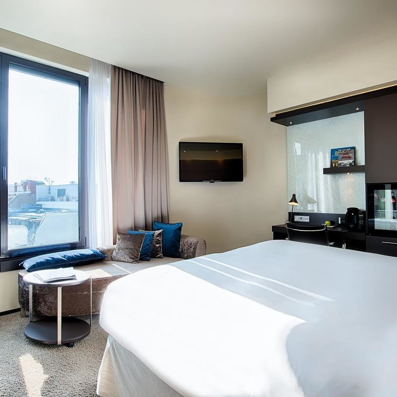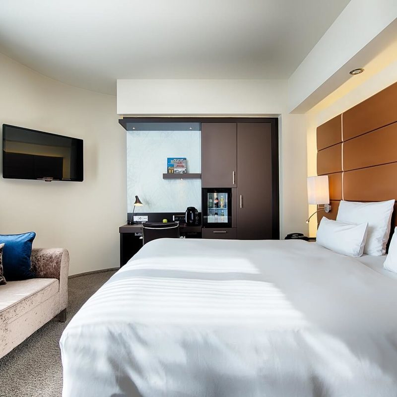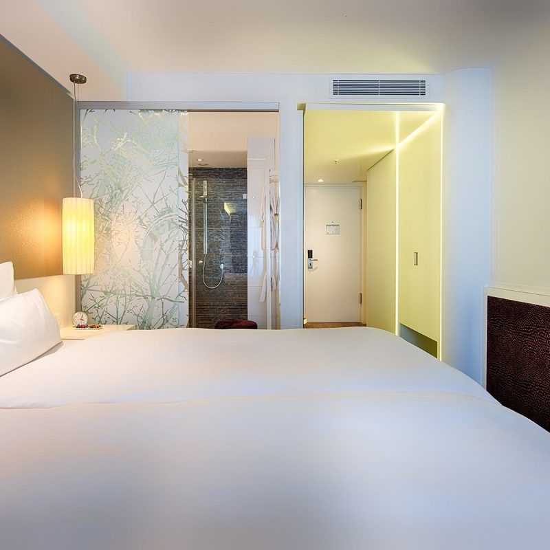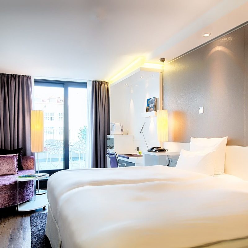 The crème de la crème can be found in our largest rooms (28m²) in the SUPERIOR category. The furniture varies between brown and white. Located on the higher floors with a view over the beautiful garden (brown) or over the courtyard (white), we recommend these rooms for longer stays for two or three (extra bed possible – 40 € per night). Some of the rooms with white furnishings have a terrace and can be converted into twin rooms. Here you sleep peacefully and have enough space to store your luggage. The spacious bathrooms have either a bathtub or a shower.